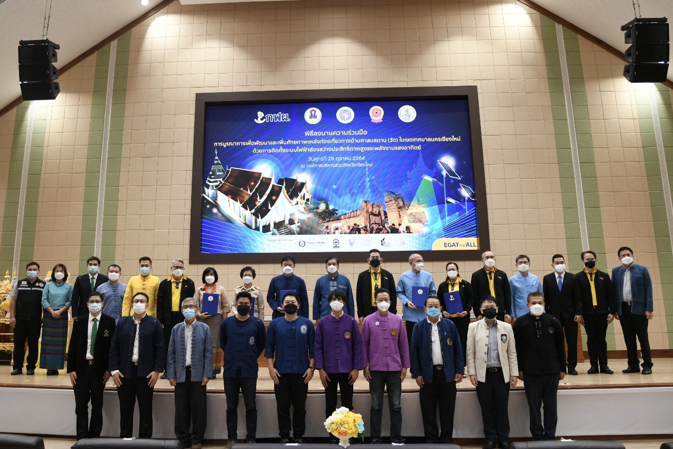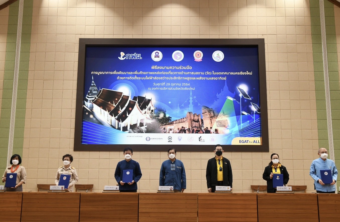 On October 29, 2021, Chiang Mai Provincial Administrative Organization (PAO), Chiang Mai University, Chiang Mai Provincial Office of Buddhism, Chiang Mai Public Relations Office, and EGAT signed the MOU on “Raising Potential of Religious Tourism (Temples) through Solar Cell Lighting System Installation.” On this occasion, Mr. Pichai Lertpongadisorn, Chairman of Chiang Mai PAO; Clinical Professor Dr. Niwes Nantajit, President of Chiang Mai University; Ms. Jureerat Jaikaeng, Director of Chiang Mai Provincial Office of Buddhism; Ms. Chanisa Chomsil, Chiang Mai Public Relations Officer; and Mr. Boonyanit Wongrukmit, EGAT Governor declared a mutual intention. In the signing ceremony, Dr. Jiraporn Sirikum, EGAT Deputy Governor – Strategy was the representative of EGAT who signed the MOU. Also, Mr. Pattana Sangsriroj, Advisor to the Minister of Energy, attended the event, held at the Chiang Mai PAO.