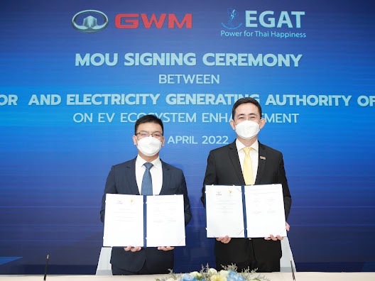 28 April 2022Great Wall Motor Co., Ltd. (GWM) signed a Memorandum of Understanding on EV Ecosystem Enhancement with three electricity authorities, namely Electricity Generating Authority of Thailand (EGAT), Metropolitan Electricity Authority (MEA), and Provincial Electricity Authority (PEA) to combine the expertise of GWM, a leading EV manufacturer in Thailand, with the proficiency in electricity business of the three electricity authorities, to enhance the EV ecosystem and promote Thailand’s EV industry sustainably.