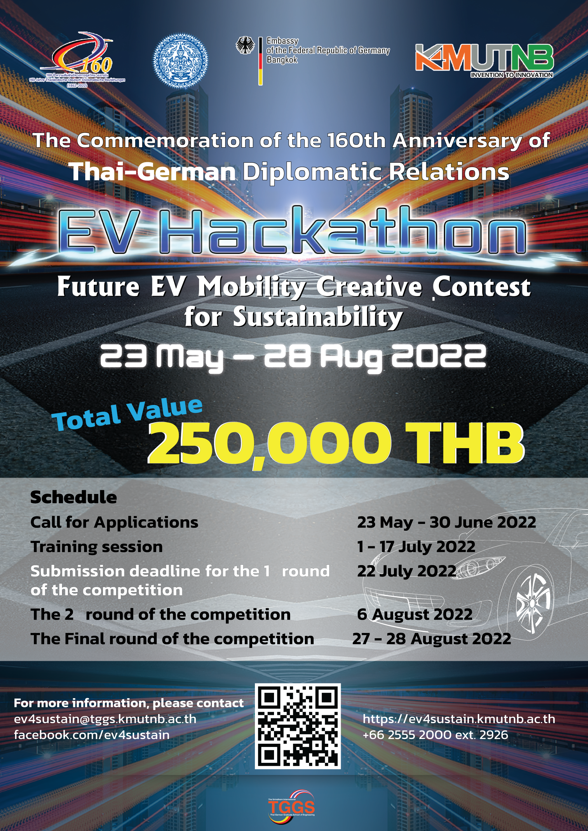 The EV Hackathon held from June – August 2022 is open for students between 18-35 years old to participate in online workshops and submit their presentation as teams of three students. The eight selected teams will compete in the final round of 24-hour EV Hackathon at KMUTNB during August 27-28, 2022 to win a total cash prize of 250,000 Baht. Find more information about the EV Hackathon at https://ev4sustain.kmutnb.ac.th/.