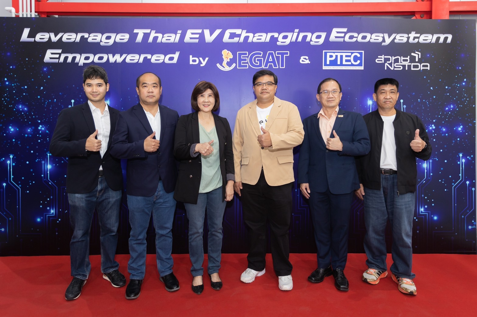 On July 7, 2022, Mr. Warit Rattanachuen, Assistant Governor – Project Management Office of the Electricity Generating Authority of Thailand (EGAT); Mr. Sathit Krongsut, Assistant Governor – Research, Innovation and Business Development of EGAT; Mrs. Ketwarong Hongladaromp, Vice President – Special Affairs of the National Science and Technology Development Agency (NSTDA); and Dr. Kraison Aunchaleevarapan, Director of the Electrical and Electronic Products Testing Center (PTEC) attended the launching of the testing center for high-powered electric vehicle (EV) chargers of IEC 61851 standard at the Electrical and Electronic Products Testing Center (PTEC), EV Division, Thailand Science Park, Pathum Thani Province.
