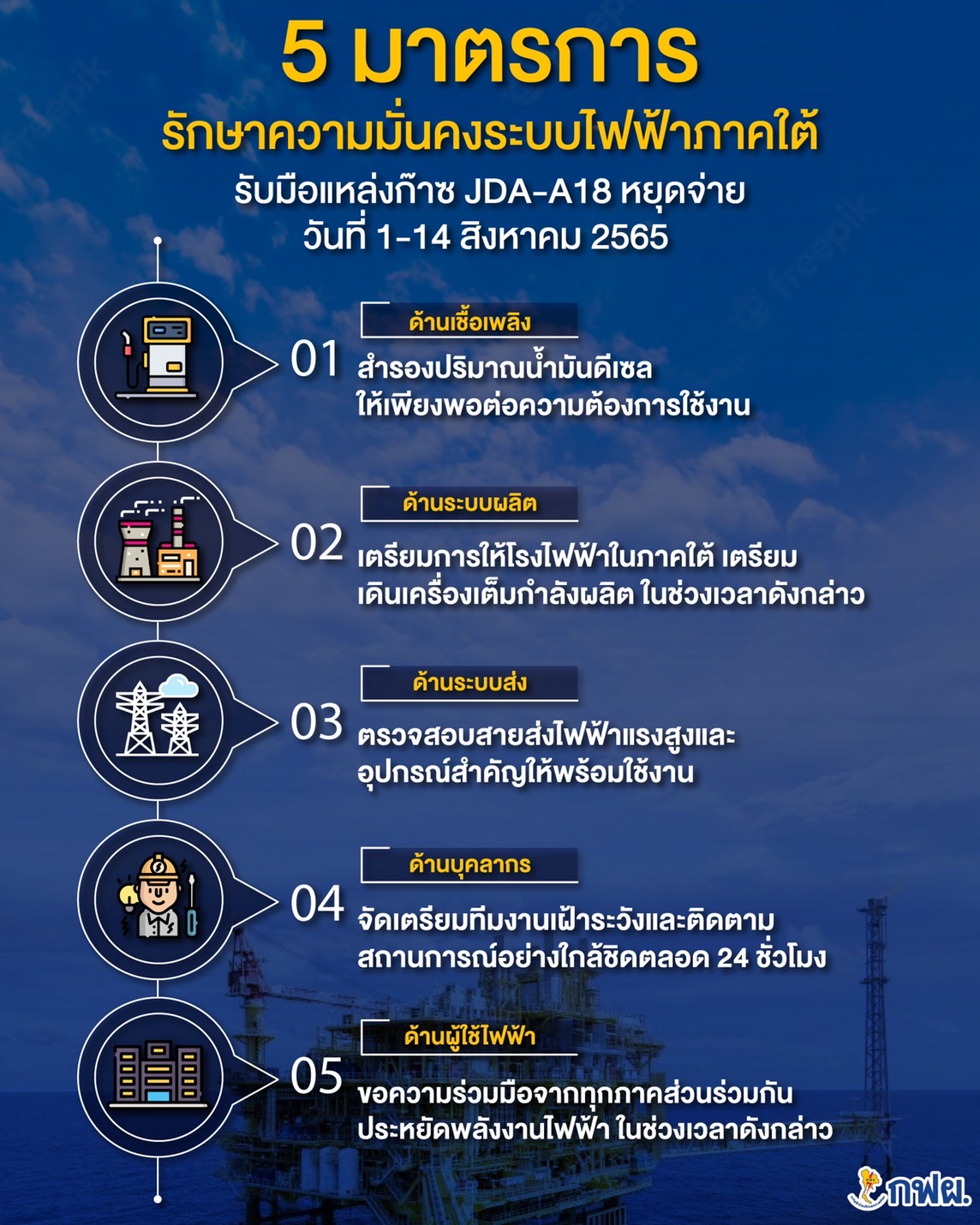 EGAT has prepared five measures to deal with the Malaysian-Thai Joint Development Area (JDA-A18) natural gas supply cut due to annual maintenance during August 1-14, 2022 and ensured that there will be no effects on electricity users of the South. Cooperation from all sectors in the South to save electricity between 6.00-9.30 p.m. is also requested.