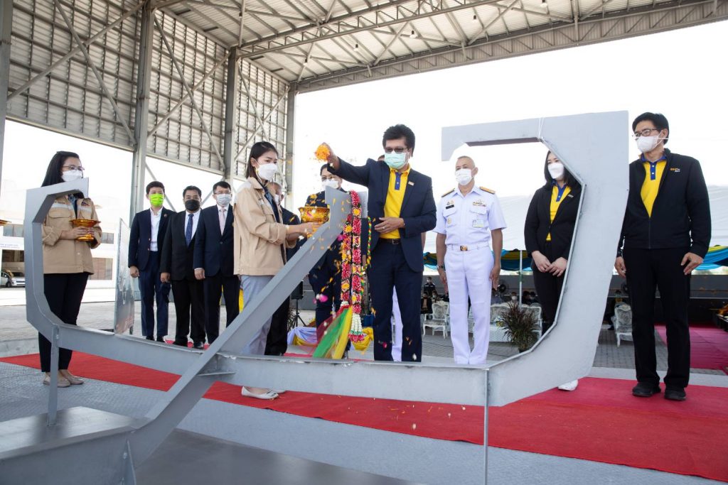Vice Admiral Wiroj Nilpong, Director-General of Royal Thai Naval Dockyard and Rear Admiral Thanakorn Changchit, Director of Mahidol Adulyadej Dockyard attended a keel-laying ceremony for Thailand’s first EV amphibious boat held by the Bangkok Dock Company Limited (BDC) and the Electricity Generating Authority of Thailand (EGAT). Mr. Prasert Intub, Assistant Governor – Renewable Power Plant laid the keel to officially mark the start of ship construction at the Bangkok Dock Company Limited (Sattahip) in Sattahip District, Chon Buri Province.