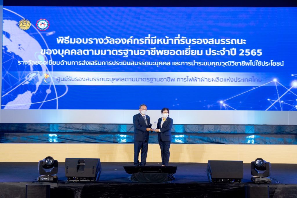Miss Noppavan Kanjanavan, Deputy Governor – Administration of Electricity Generating Authority of Thailand (EGAT), as EGAT representative, received ‘Excellence’ award in competency certification on occupational standards 2022, resulting from the operation of EGAT Personnel Competency Certification Centers since 2021. The event “Professional Qualification for Workforce” was held by the Thailand Professional Qualification Institute (Public Organization) (TPQI) and presided over by Mr. Suchart Chomklin, Labour Minister, on September 14, 2022, at Royal Thai Army Club, Bangkok.