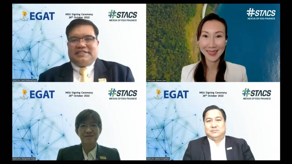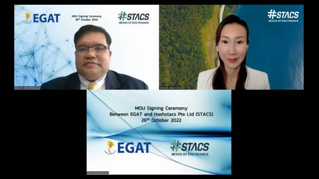 On October 26, 2022, there was a virtual signing ceremony of the Memorandum of Understanding (MOU) signed by Mr. Warit Rattanachuen, Assistant Governor – Research, Innovation and Business Development of Electricity Generating Authority of Thailand (EGAT) and Ms. Sharon Yuen, Chief Commercial Officer of Hashstacs Pte Ltd. (STACS) to drive ESG with innovation to achieve ASEAN sustainability.