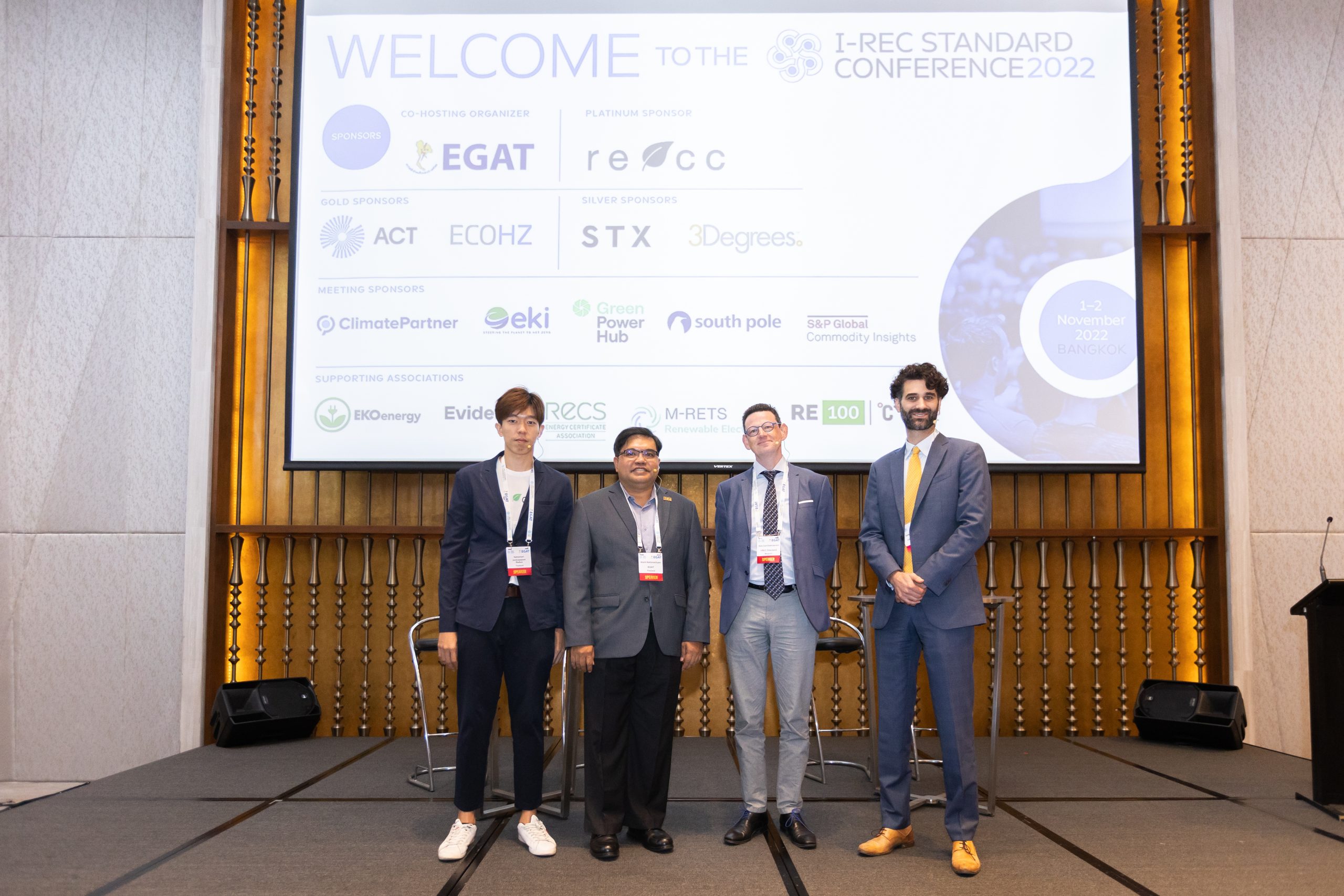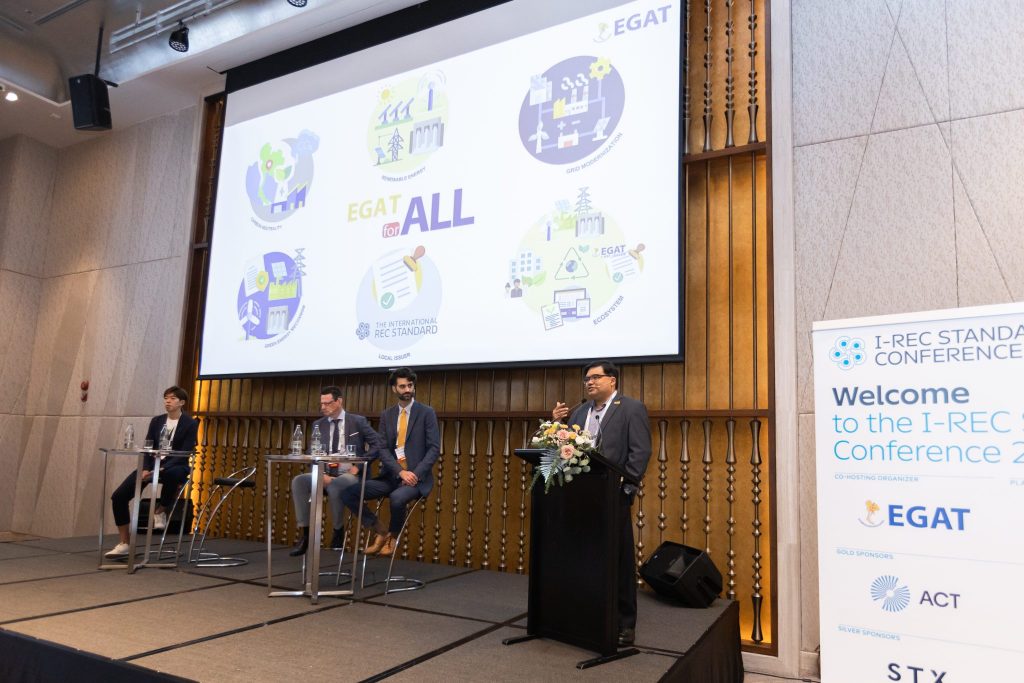 Electricity Generating Authority of Thailand (EGAT) and International REC Standard Foundation (I-REC Standard Foundation) organized I-REC Standard Conference 2022 during October 31 – November 2, 2022, at the Millennium Hilton Bangkok Hotel. On November 1, 2022, Mr. Warit Rattanachuen, EGAT Assistant Governor – Research, Innovation and Business Development, attended the seminar on the topic “Standardizing Global Attribute Markets,” together with Mr. Dirk van Evercooren, Board Member of I-REC Standard Foundation, Mr. Jared Braslawsky, Managing Director of I-REC Standard Foundation, and Mr. Nattachart Jarujinda, Managing Director of ReAcc Co., Ltd., to standardize energy attribute certificate and drive the mechanism of Renewable Energy Certificate (REC) toward sustainable business operation in ASEAN.
