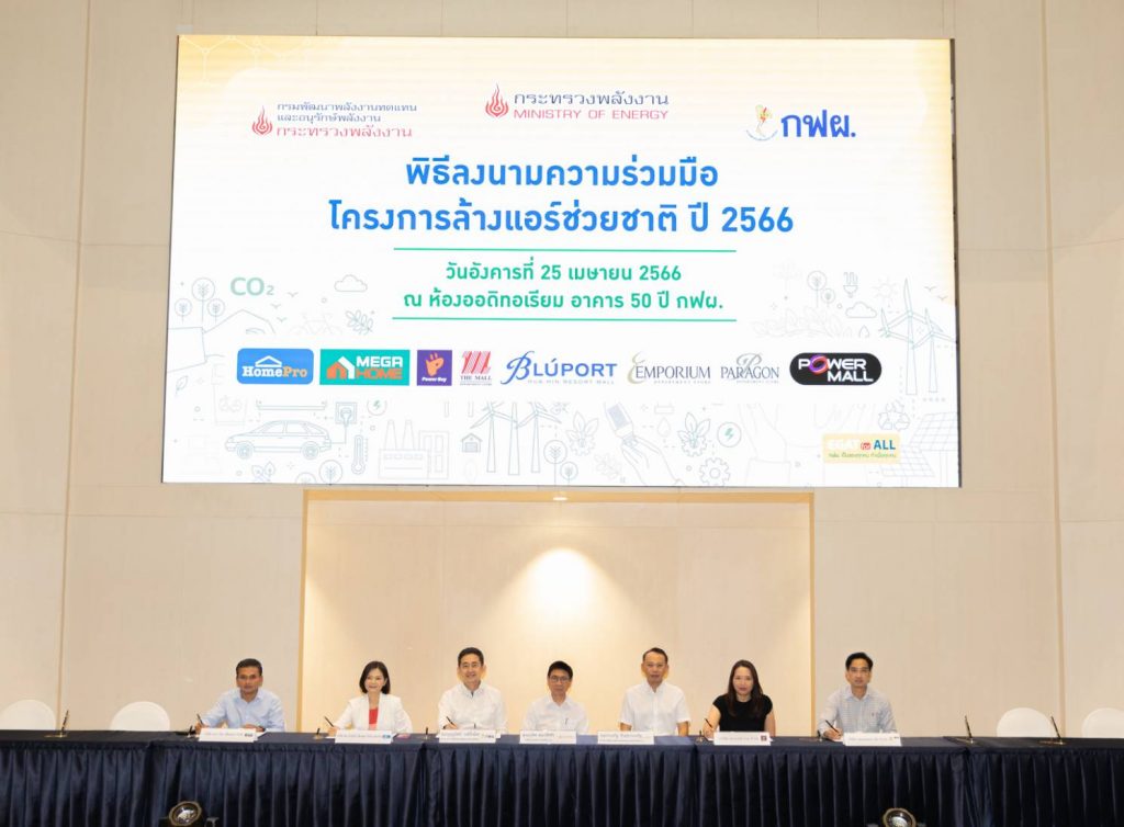 1. Clean Your Air, Care Your Life Project: EGAT, in collaboration with department stores and retail services, will offer 10,000 cleaning services for air conditioners at half price to the public who consume less than 500 units of electricity per month. The public will pay a cleaning fee of 300 baht, limited to one service per household for a wall-mounted air conditioner not exceeding 24,000 BTU per hour. To receive the service, participants must present their ID card and two months of electricity bills at the participating department stores which are Power Buy, The Mall, The Emporium, Siam Paragon, and Blueport from May 1 to July 31, 2023.
