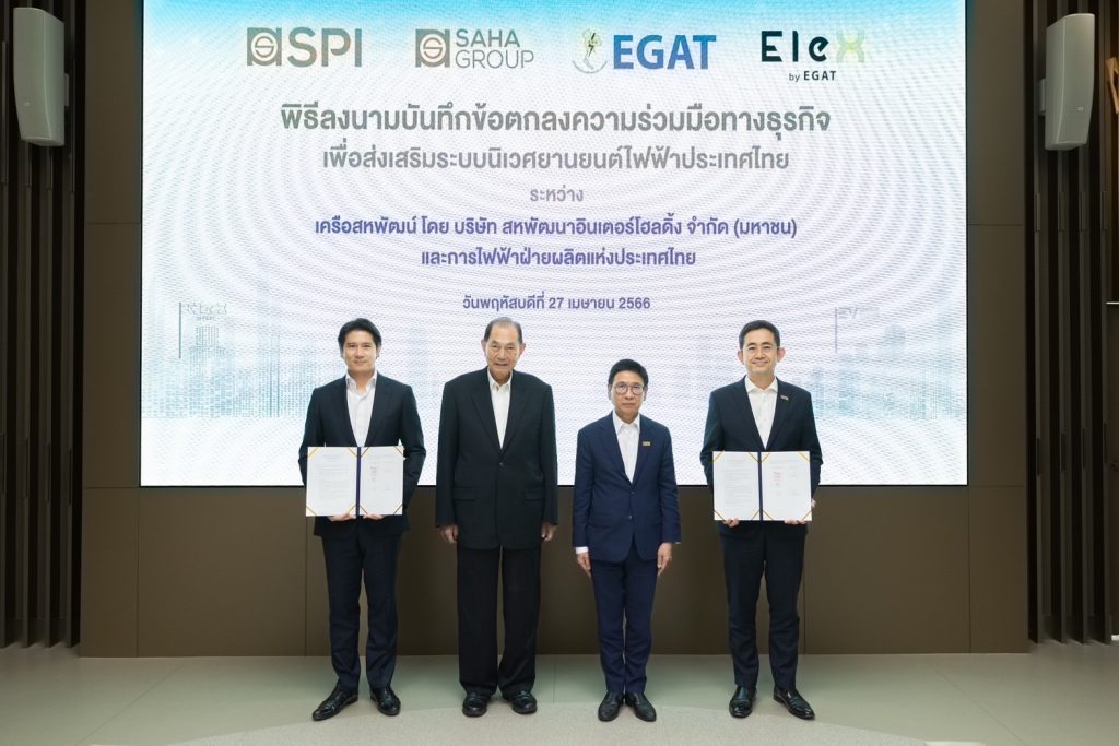 On April 27, 2023, Mr. Vichai Kulsomphob, President & CEO of Saha Pathana Inter-Holding Public Company Limited (SPI), and Mr. Boonyanit Wongrukmit, Governor of the Electricity Generating Authority of Thailand (EGAT), signed a memorandum of understanding on business cooperation to support the EV ecosystem in Thailand. Mr. Boonsithi Chokwatana, Chairman of Saha Group, and Mr. Kulit Sombatsiri, Chairman of EGAT, were the honorary witnesses at the ceremony held at EGAT Headquarters in Bang Kruai District, Nonthaburi Province.