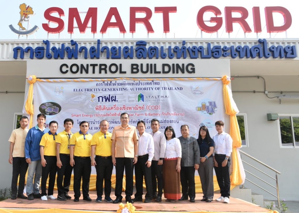 On May 25, 2023, Electricity Generating Authority of Thailand (EGAT), under the Smart Grid Pilot Project in Mae Hong Son Province, held a Commercial Operation Date (COD) ceremony for the 3 MW Solar Power Plant and 4 MW Battery Energy Storage System (BESS) Project. Mr. Chettha Mosikarat, Governor of Mae Hong Son Province, presided over the ceremony together with Mr. Chaiwut Lakmuang, EGAT Assistant Governor – Sustainability Management, Mr. Bandit Tangpokanon, Acting Provincial Energy Officer of Mae Hong Son Province, and Mr. Akaporn Kongjit, Project Manager of the contract company, Italthai Engineering Co., Ltd. The ceremony was also joined by public and private agencies and community leaders at Mae Hong Son Smart Grid Pilot Project, Pha Bong Sub-district, Mae Hong Son District, Mae Hong Son Province.