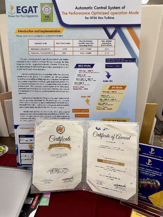EGAT also won a Silver Medal and a Special Award from the Indonesian Invention and Innovation Promotion Association (INNOPA) for EGAT’s invention “Automatic Control System of the Performance Optimized Operation Mode for GT26 Gas Turbine.” It is a development of the control system for the GT26 Gas Turbine installed at the North Bangkok Power Plant since 2021. Originally, the operation mode can only be switched by the machine operator, but the newly developed system can help choose the maximum power output according to the power purchase agreement. It saves scheduled maintenance cost, increases power system stability, reduces error, and decreases the responsibilities of the operator so they can do other work efficiently. The innovation will help save scheduled maintenance cost of 3 million baht/year/unit and can be applied to other power plants as well.