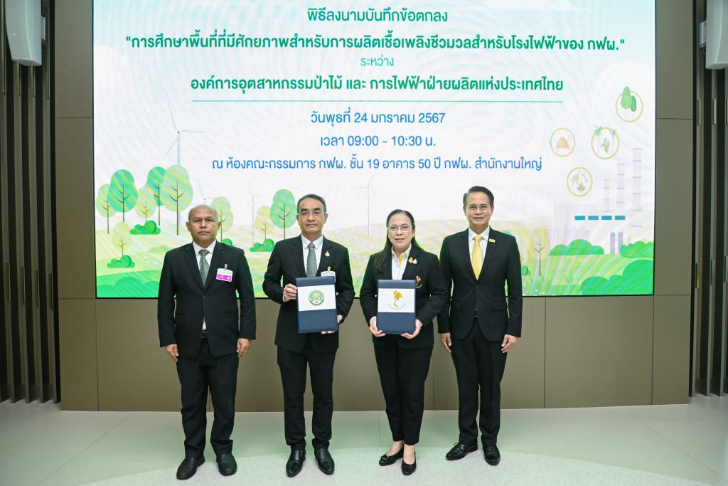 On January 24, 2024, Dr. Jiraporn Sirikum, Deputy Governor – Power Business and Acting Governor of the Electricity Generating Authority of Thailand (EGAT), and Mr. Sukit Junthong, Managing Director of the Forest Industry Organization (FIO), signed a memorandum of understanding (MOU) to study potential areas for producing biomass fuel for EGAT power plants at the 50th Anniversary Building, EGAT Headquarters, Nonthaburi Province.