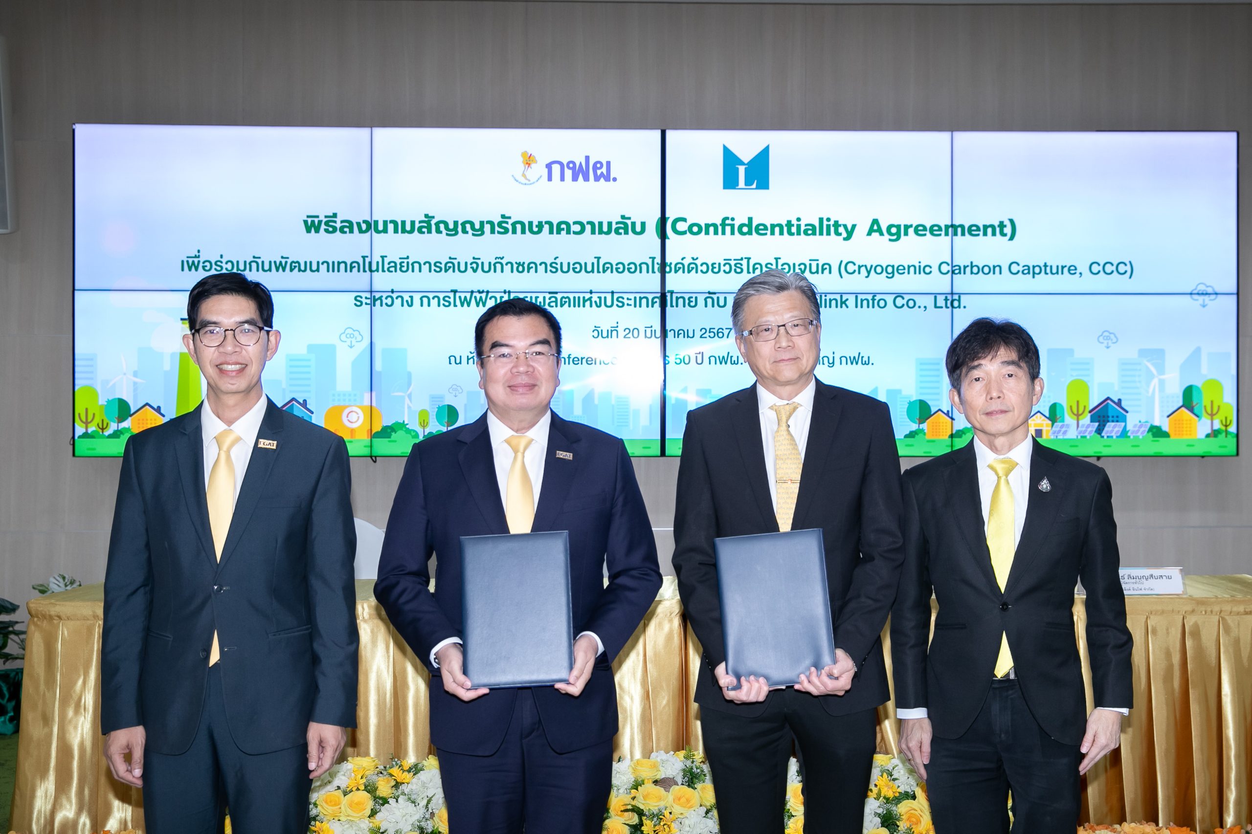 On March 20, 2024, Mr. Thidade Eiamsai, Deputy Governor – Power Plant Development and Renewable Energy of Electricity Generating Authority of Thailand (EGAT), and Mr. Prapan Asvaplungprohm, Director and Chief Executive Officer of Metlink Info Co., Ltd. (Metlink), entered into the Confidentiality Agreement (CA) on Information Exchange on Cryogenic Carbon Capture (CCC) Technology. On this occasion, Mr. Chatchai Mawong, EGAT Assistant Governor – Power Plant Engineering and Construction, and Mr. Nipon Limboonsuebsai, Metlink General Manager, were the witnesses in the signing ceremony, held at EGAT 50th Anniversary Building, EGAT Headquarters, Nonthaburi Province.