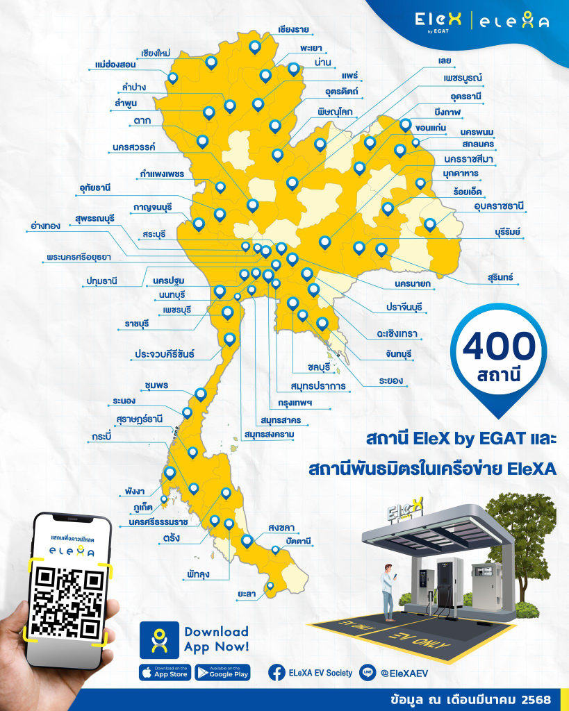 During the past 4 years, EleX by EGAT charging stations and EleXA application have become assistants for EV users, emerging as a top of mind charging station for many people. Meanwhile, BackEN EV is responsible for connecting businesses with investors, making it easy for them to manage their stations. Thus, there are now over 400 EleX by EGAT charging stations and partner stations in total. In the future, EGAT will continue to collaborate with partners to increase the number of charging stations and offer other solutions to enhance the EV ecosystem, support eco-friendly travelling, and pass on a sustainable society for future generations.