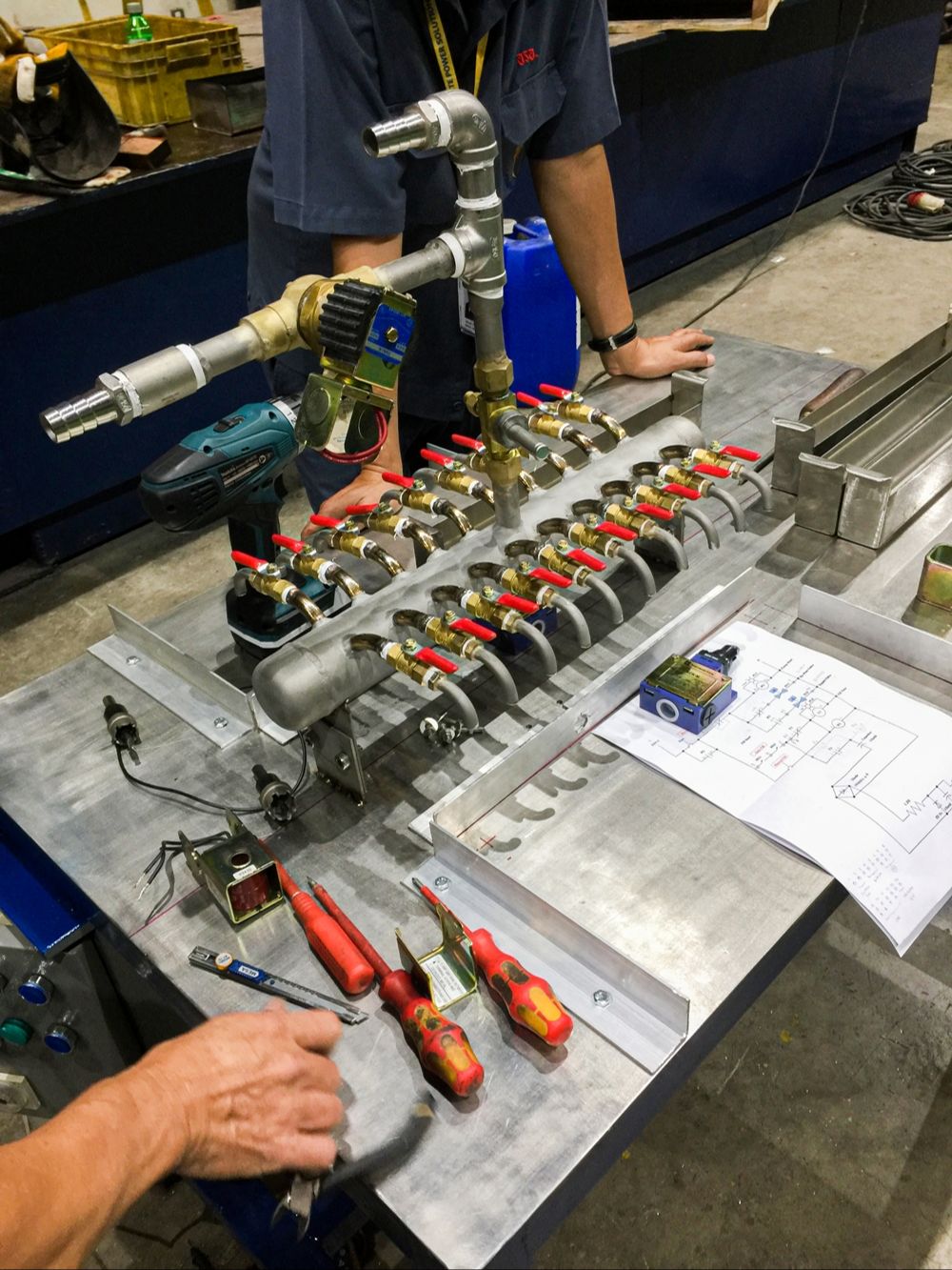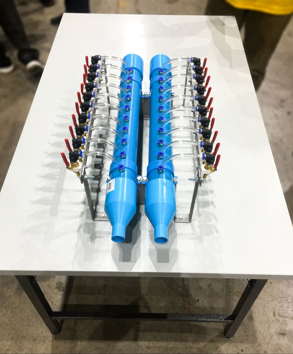 The staff from Workshop and Spare Parts Division joined hands to design and invent 2 hand sanitizer gel filling machines. The first machine has 1 header connected with 20 alcohol dispensers made of stainless steel. These dispensers are divided into 2 sides, each of which has 10 dispensers attached, which can contain 20 bottles (180 cc) of alcohol gel per minute. However, the first machine has a constraint that is 20 dispensers need to run all at once. In case that any dispenser is broken, the whole machine must stop running.