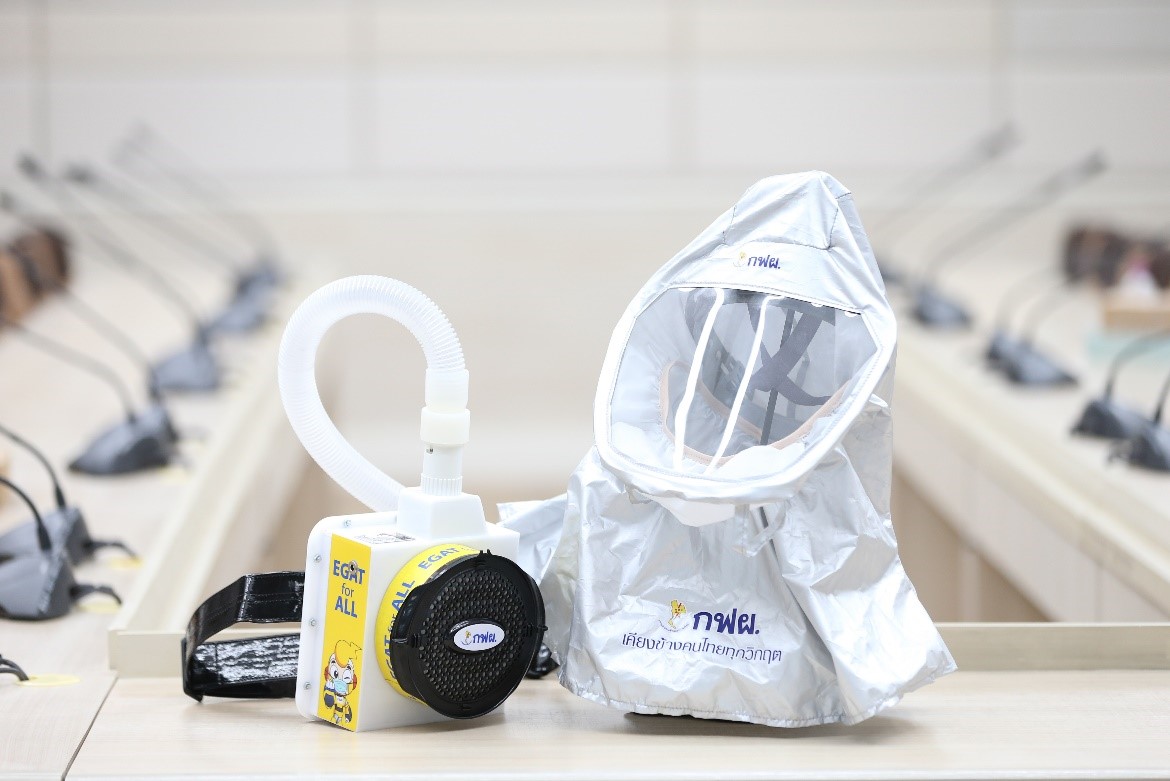 EGAT produced PAPR protective headgears with an emphasis on efficiency and safety standards under the consultation and guidance of the medical team. It has been carefully developed with unique features, making it different from the usual version because the team had monitored the testing results and had made improvements until they were satisfied. This version of the PAPR protective headgear is lightweight, has a wide screen, provides flexible head movement, and also blows cool air from an ultra-low noise fan motor, which the user can adjust the wind speed to be balanced for a clearer communication between the medical team. Moreover, it also has a powerful battery-powered system that works with fast charging. Therefore, it is effective for working alongside the doctor for up to eight hours, which supports the usage in difficult situations during this period.