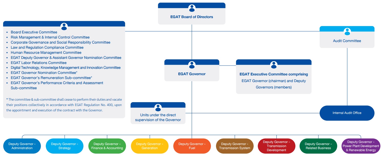 EGAT’s governance structure is transparent and systematic. It comprises the EGAT Board of Directors, appointed by the Cabinet, which is responsible for setting policies and overseeing EGAT’s operations in accordance with the principles of good governance. The Board has also appointed 12 subcommittees to assist in screening and reviewing key matters.