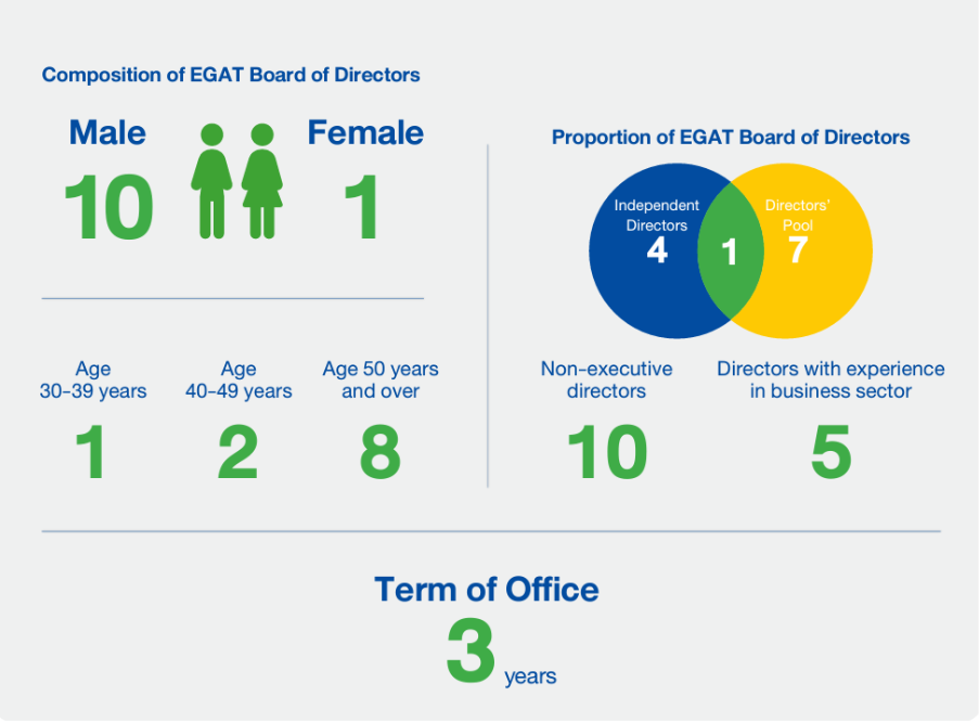 The EGAT Board of Directors consists of a Chairperson and no more than 10 other members, including the Governor, who serves as an ex officio member. Each board member serves a three-year term.