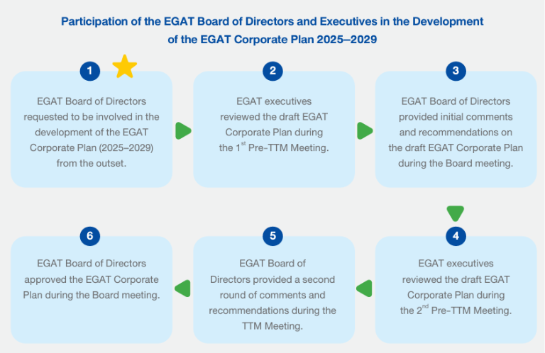 The management incorporated the Board’s feedback into the draft corporate plan. At EGAT Board Meeting No.9/2024 on 31 July 2024, the Board approved the EGAT Corporate Plan 2025-2029 and agreed to submit it to the Ministry of Energy for endorsement before forwarding it to the State Enterprise Policy Office.
