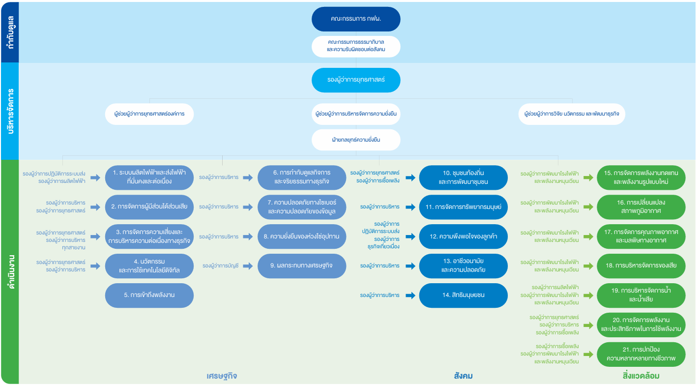 กฟผ. กำหนดให้รองผู้ว่าการยุทธศาสตร์มีบทบาทในการวางแผนยุทธศาสตร์เพื่อกำหนดทิศทางการดำเนินงานขององค์การ ซึ่งครอบคลุมถึงยุทธศาสตร์ด้านความยั่งยืน มีผู้ช่วยผู้ว่าการบริหารจัดการ